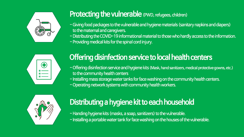 We, Miral Welfare Foundation, have supported 19,569 people through our 9 branch offices in different 8 nations by giving them hygiene kits with masks and food packages, since COVID-19 outbreaks burst. For our support, we contacted the vulnerable first ? PWD, Children, Refugees ? in an “untact” way via phone or social network and assessed their situations as well as their requests. Then we packed the kits and delivered it to meet their needs.