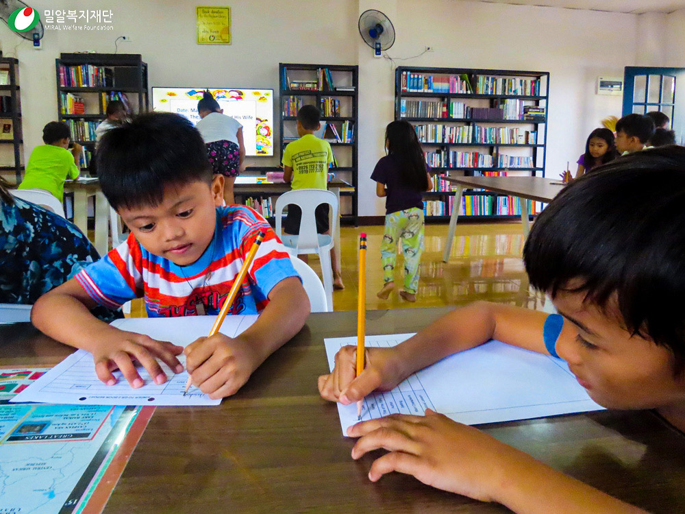 The center is an ocean of smiling and confident faces of children who write their names on the paper.